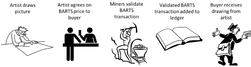 The Blockchain ART Simulation (BARTS) and related experiential online exercises facilitate understanding blockchain concepts. The BARTS simulation is a non-technical simulation where participants mine or validate a digital coin transaction for buying and selling drawings (see Figure 1). Graduate students, undergraduate students, and high school students with technical and non-technical backgrounds have used the simulation to get a clearer idea of blockchain mining concepts.